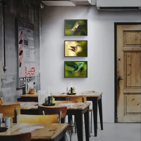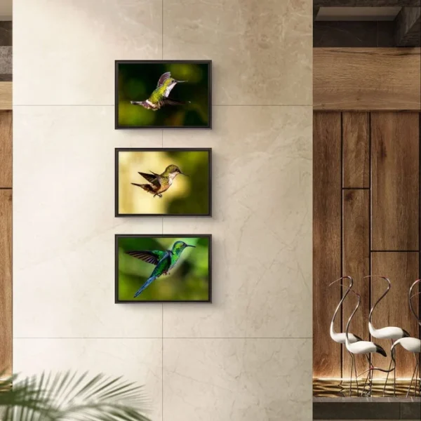 Transforme seu espaço com a beleza vibrante e delicada dos beija-flores, capturados de forma realista em momentos de voo, no coração da Mata Atlânica. Este conjunto exclusivo de 3 quadros de tamanhos iguais (42cm x 30cm) traz cores vivas e um realismo que impressiona, ideal para destacar qualquer ambiente com elegância e serenidade.
